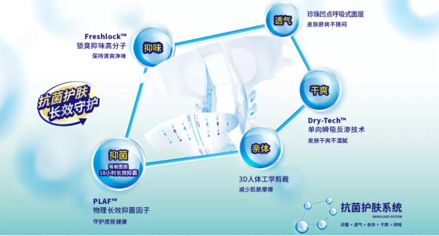 红疹、瘙痒、失禁性皮炎等皮肤问题是由于细菌感染导致的,因此,挑选具有抗菌护肤功效的纸尿裤,从源头抑制细菌的滋生,才能取得事半功倍的照护效果。