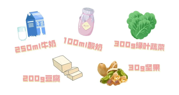 以上食物组合大概可以达到成年人每日所需钙摄入量。50岁以上人群,钙摄入量需每日1000~1200mg。