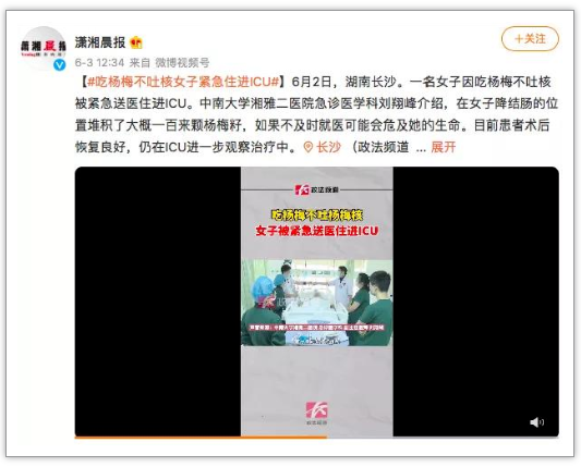 但近日冒出了吃杨梅核具有清肠解毒的作用,这样的说法并不存在科学依据,一次性吞入太多,容易引起肠梗阻,危及生命。