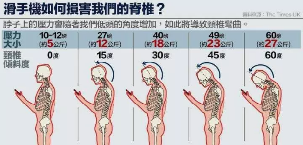 当你前倾低头60度看手机时,颈部就需承受25~30公斤的重量。
