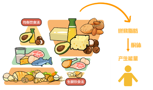 均衡饮食法主食摄取较多,是人体主要能量来源,而生酮饮食正好相反,主食吃的极少,身体被迫分解脂肪,产生酮体,保持能量的正常供应。