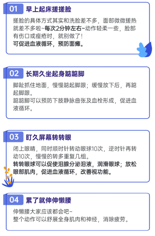 ● 看屏幕1小时后要让眼睛休息一下,看看远处,做眼保健操,也可以用毛巾冷敷双眼,减少眼睛的充血;