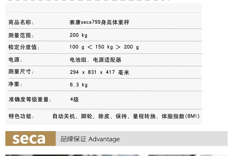 德国赛康SECA799电子身高体重秤带BMI功能200KG身高体重秤