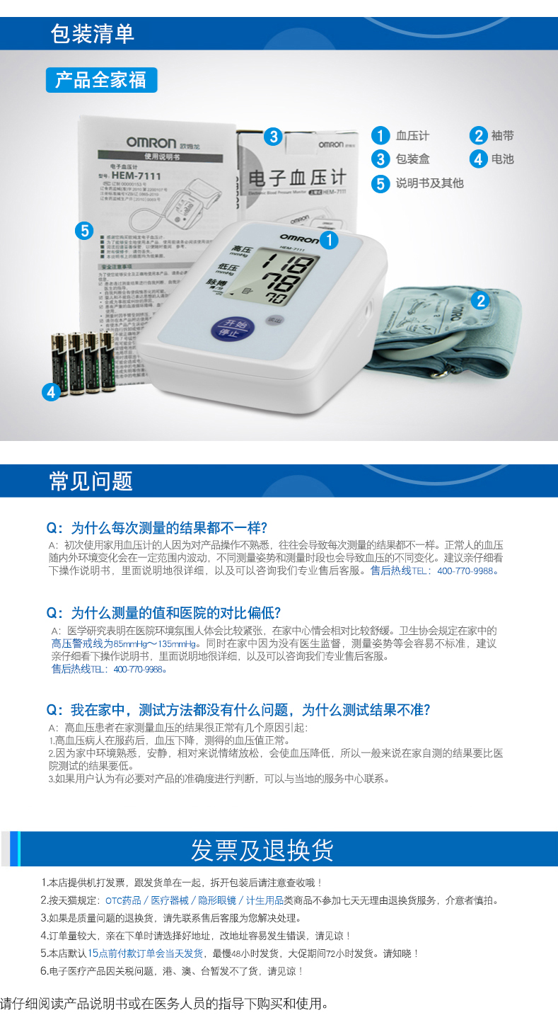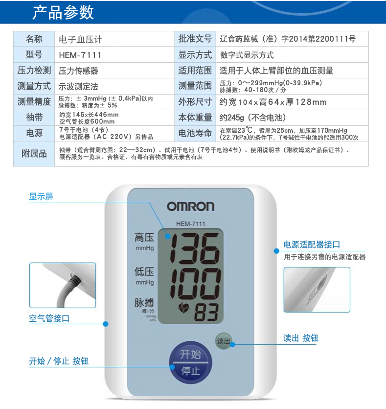 欧姆龙电子血压计上臂式全自动加压高清大屏测血压仪器 HEM-7111