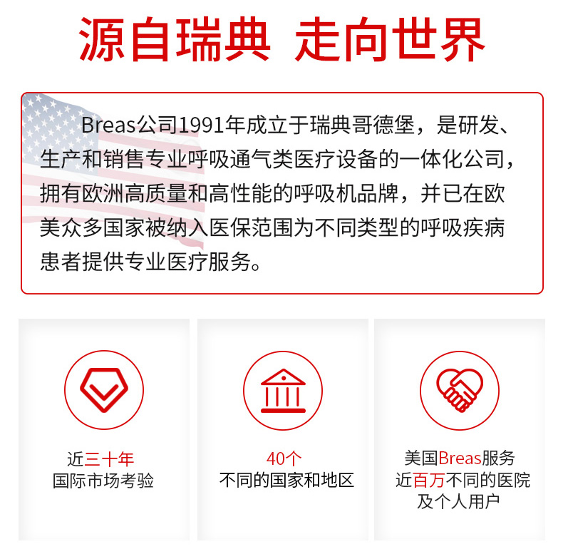 博毅雅Breas是欧洲著名呼吸机品牌,总部位于瑞典,于1991年在瑞典哥德堡成立。博毅雅Breas研发生产的医用无创呼吸机具备远程操作、自带储电功能、方便移动、支持无创有创一体转换等特点